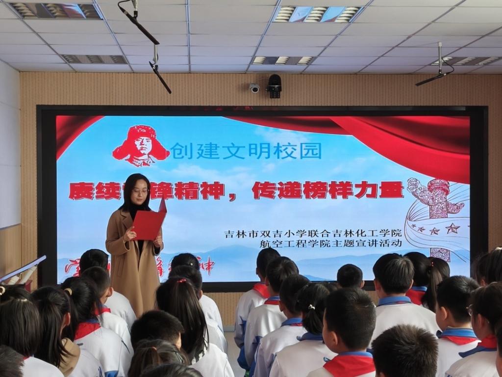 3月27日,吉林化工学院航空工程学院宣讲团联合经开区双吉小学,开展“传红色基因话雷锋精神”主题宣讲活动。航空工程学院宣讲团用通俗易懂的语言向大家讲述了雷锋同志的生平事迹,深情描绘了雷锋从一名贫苦的孤儿成长为一名优秀的解放军战士和人民公仆的岁月历程。宣讲团成员们围绕“雷锋同志简介”“雷锋的一生”“什么是雷锋精神”“雷锋精神的时代内涵”“雷锋精神具体内容”“纪念雷锋同志”六个方面,通过具体案例的讲述,全面介绍了雷锋同志平凡而伟大的一生。号召双吉小学的同学们从身边的小事做起,让学雷锋精神事迹伴随青年成长,让雷锋精神在新时代绽放更加璀璨的光芒。