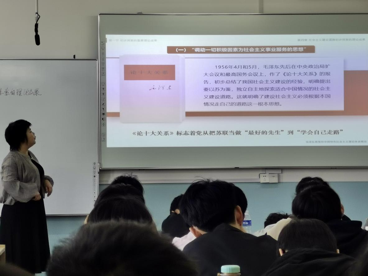 此次观摩了袁丽坤教师的《毛泽东思想和中国特色社会主义理论体系概论》课堂教学。袁老师以其扎实的专业基础、丰富的教学经验和独特的教学风格,为在场的教师们呈现了一堂生动而深刻的思政课。课堂上,袁老师以问题为导向,深入浅出地讲解社会主义建设道路初步探索的理论成果。同时结合学生实际需求,将理论知识与实际应用紧密结合,进行主题讨论,使学生们能够深刻理解和运用所学知识。