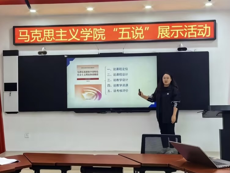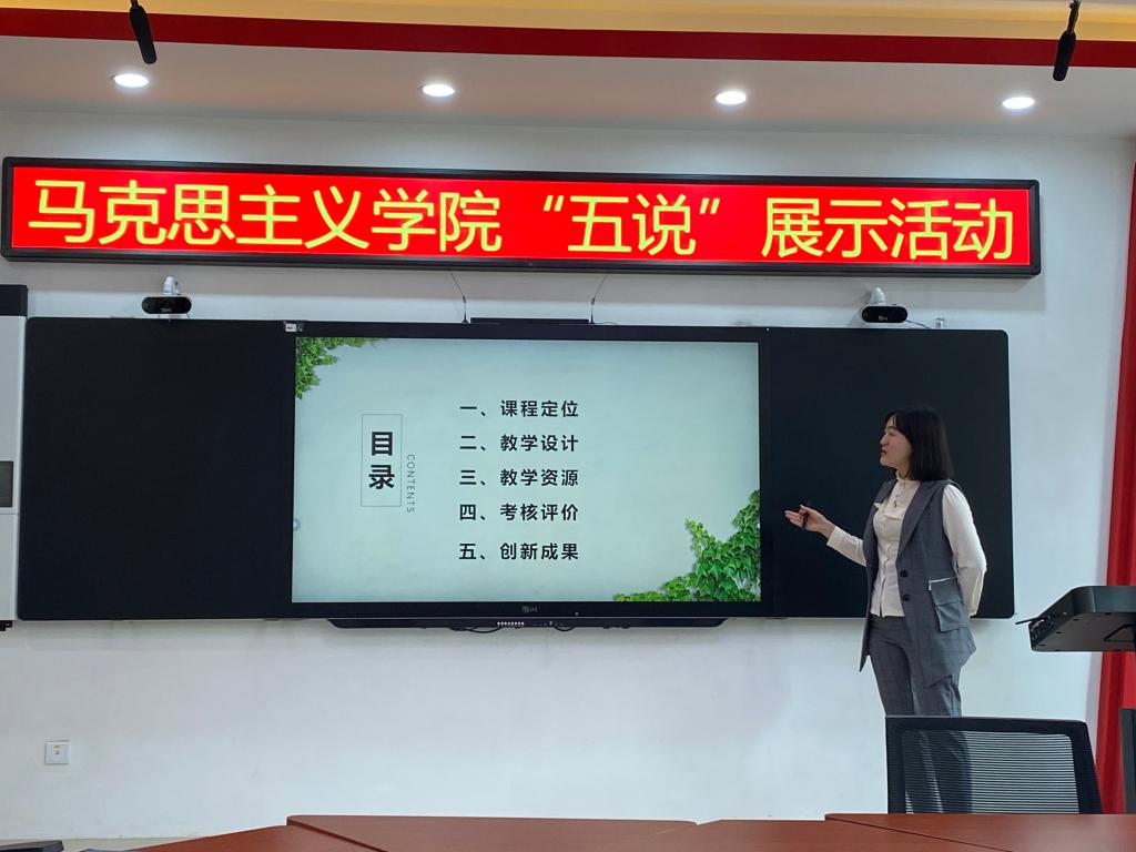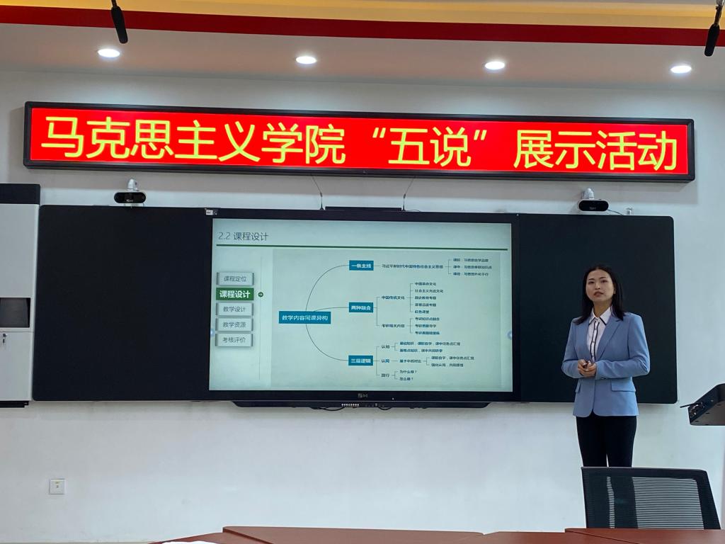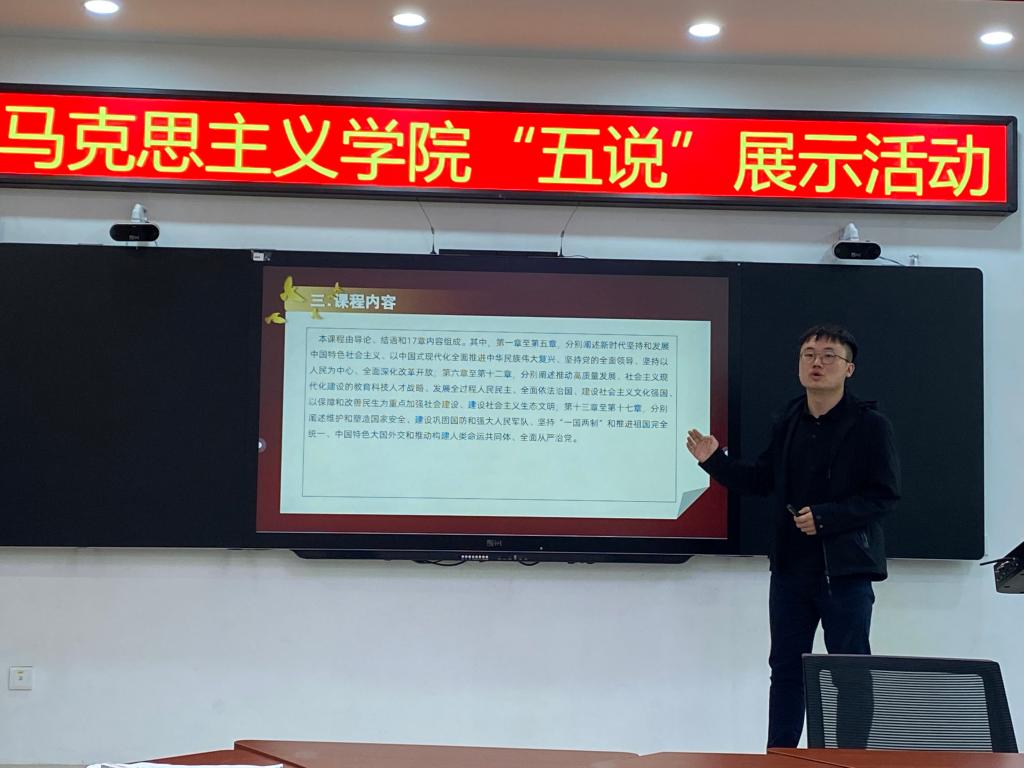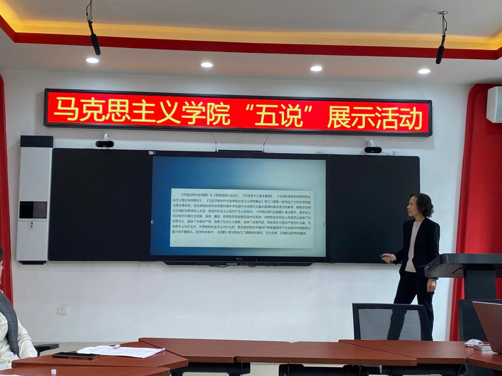 为加强新时代学校思政课建设,落实吉化院教[2024]3号文件要求,按照学校整体本科教育教学评估工作安排,切实推进马克思主义学院全体教职工深刻理解和准确把握审核评估的精髓要义,促进每位教师真正把握每门思政课的课程建设内容,马克思主义学院于2024年5月11日在双创楼207集体备课室开展“五说”展示活动。