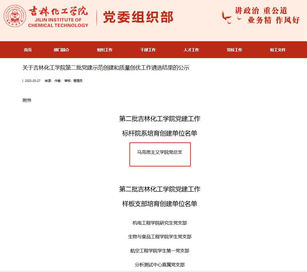 近日,学校党委公布了《关于吉林化工学院第二批党建示范创建和质量创优工作遴选结果的公示》,马克思主义学院党总支入选第二批吉林化工学院党建工作标杆院系培育创建单位。