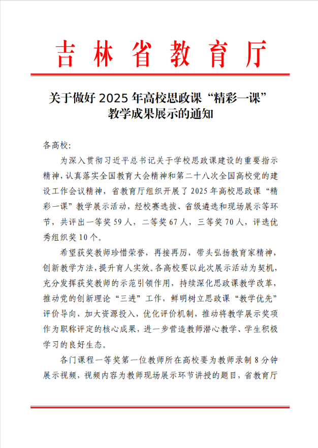 据悉,此次比赛由吉林省教育厅主办,旨在深入贯彻习近平总书记关于学校思政课建设的重要指示精神,认真落实全国教育大会精神和第二十八次全国高校党的建设工作会议精神。经校赛选拔、省级遴选和现场展示等环节,共评出一等奖59 人,二等奖 67 人,三等奖 70 人,评选优秀组织奖 10 个。