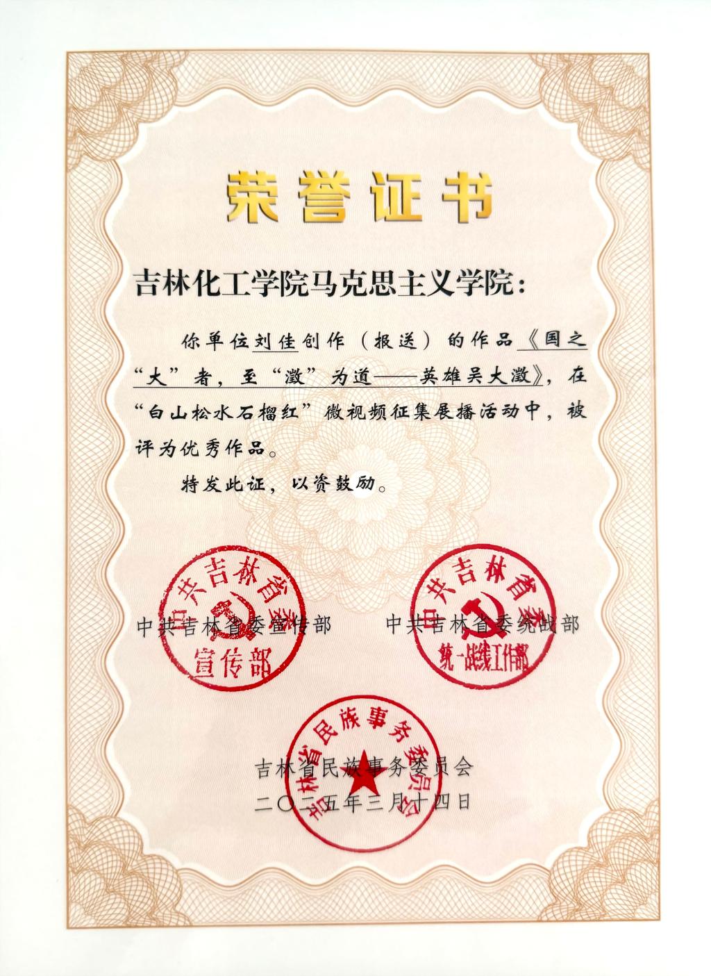 近日,省委宣传部、省委统战部、省民委公布了“白山松水石榴红”微视频征集展播活动优秀作品名单,我校马克思主义学院教师刘佳的微视频作品《国之“大”者,至“澂”为道——英雄吴大澂》被评为“优秀作品”。