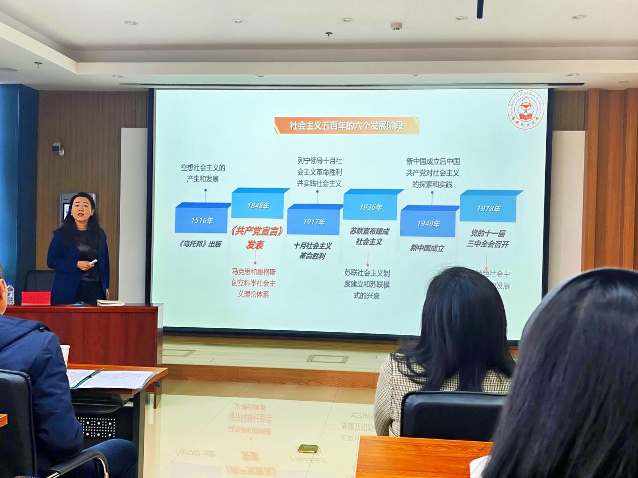 2025年4月9日下午13:30,吉林化工学院马克思主义学院举行了《马克思主义基本原理》国家一流课建设推进会暨“大思政课”教学研讨会,会议在工训大楼706举行。马克思主义学院副院长李智主持会议,吉林医药学院马克思主义学院院长张丽红教授、吉林化工学院马克思主义学院秦荣副教授就思政课国家一流课程建设进行了主题分享。学校相关职能部门领导、马克思主义学院领导班予以及学院全体老师参加了本次会议。