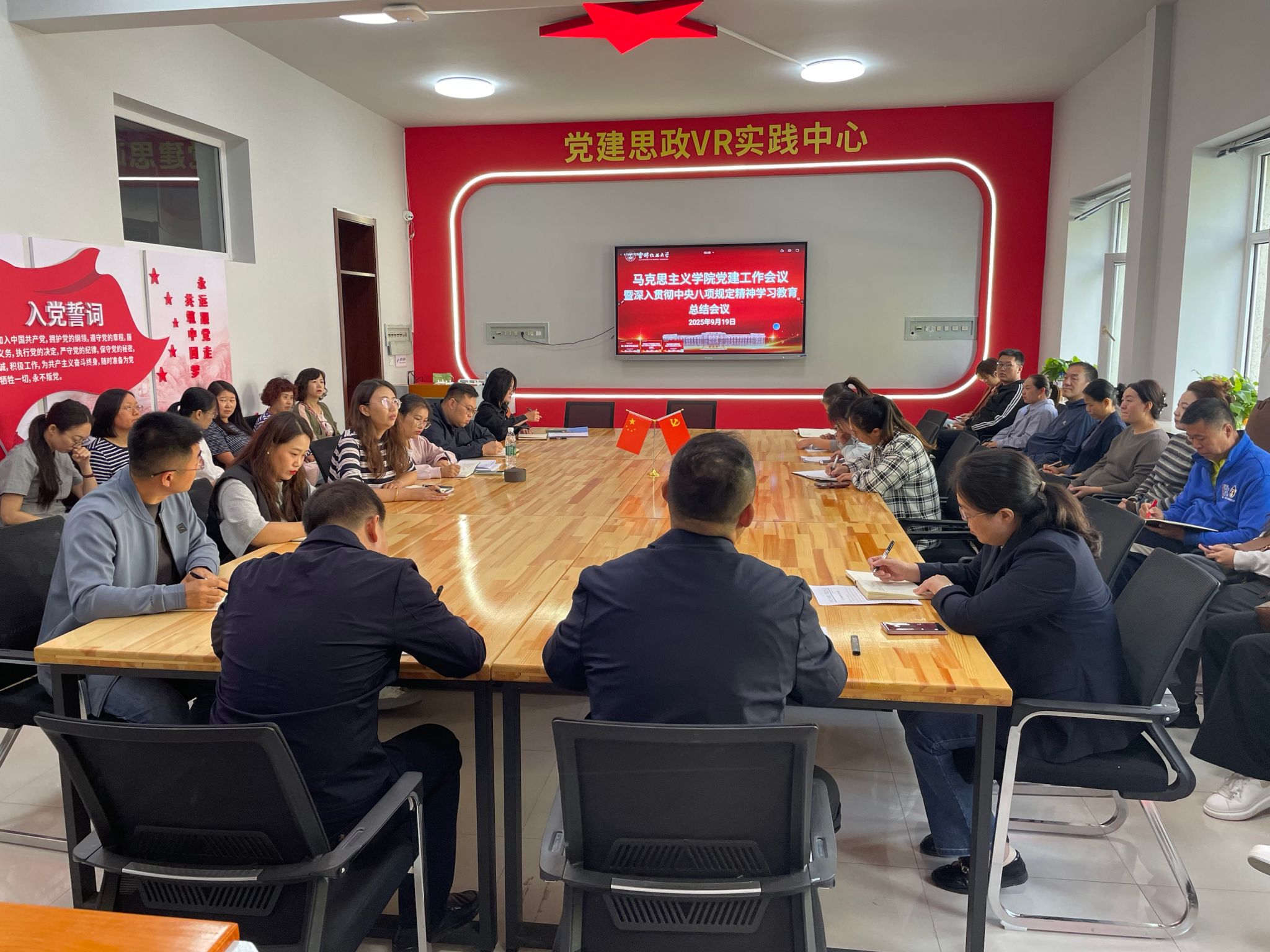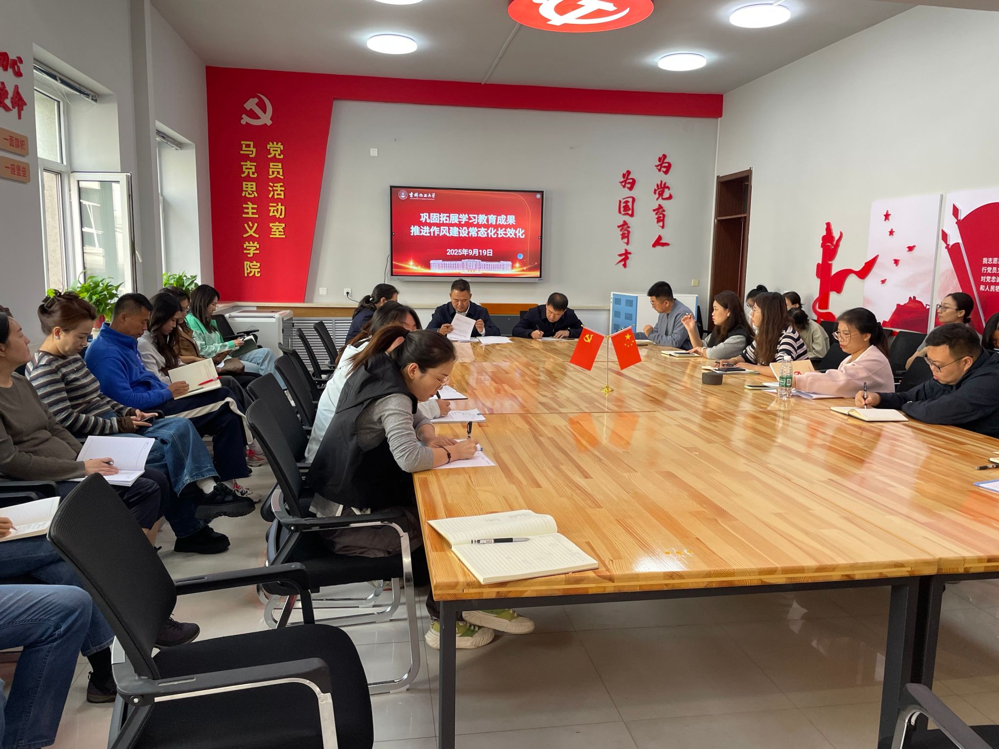 9月19日,马克思主义学院召开党建工作会议暨深入贯彻中央八项规定精神学习教育总结会议,认真学习传达习近平总书记重要指示和中央、省委党的建设工作领导小组会议精神,研究部署学院今年党建工作,总结深入贯彻中央八项规定精神学习教育工作,研究部署巩固拓展学习教育成果、锲而不舍落实中央八项规定精神、推进作风建设常态化长效化工作,以优良作风凝心聚力、真抓实干,奋力推动学校特色高水平应用型大学建设。学院班子成员、全体教师参加会议。