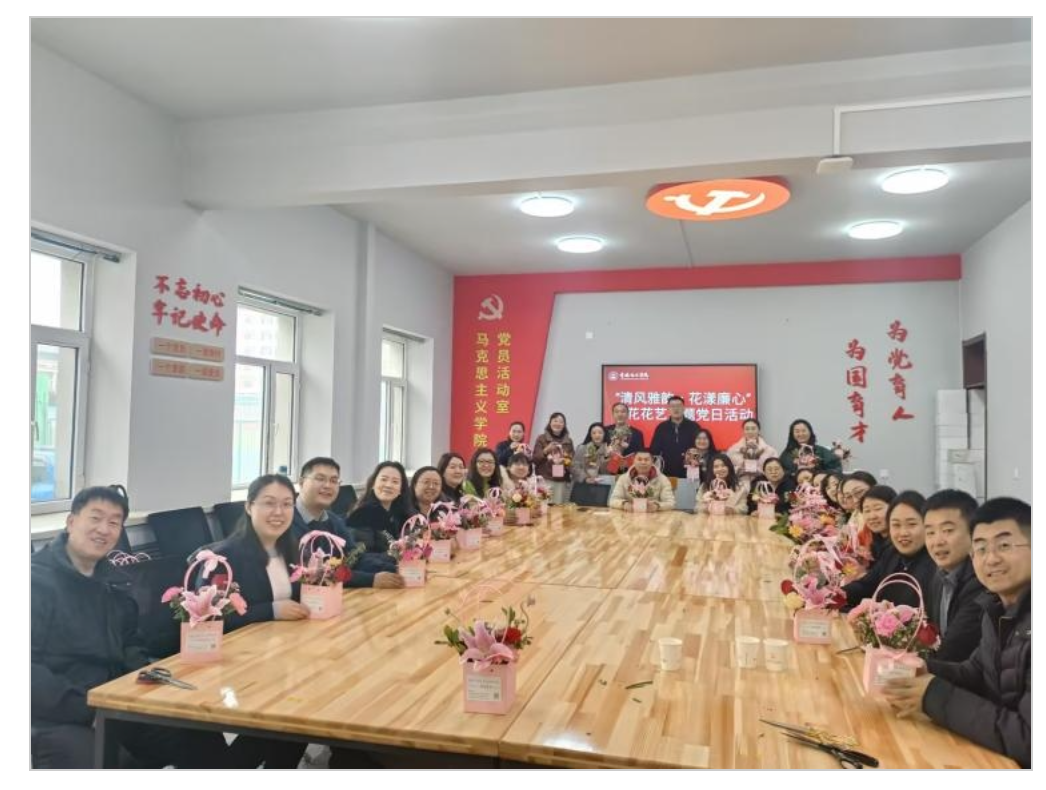 活动结束后,全体教师合影留念,定格这充满温情的时刻。本次插花活动作为马克思主义学院“三全育人”实践的重要载体,通过劳动教育与美育融合的创新形式,为推进学院文化建设注入了新活力。