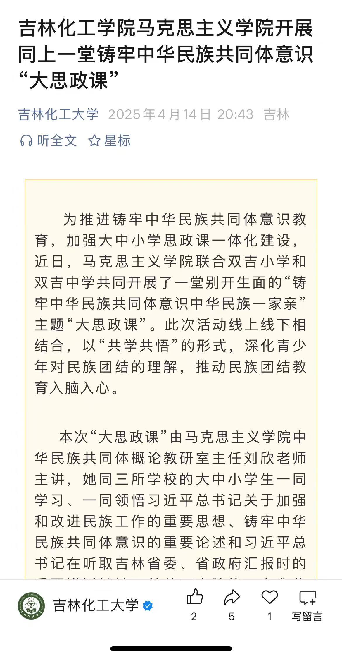 为推进铸牢中华民族共同体意识教育,加强大中小学思政课一体化建设,近日,马克思主义学院联合双吉小学和双吉中学共同开展了一堂别开生面的“铸牢中华民族共同体意识中华民族一家亲”主题“大思政课”。此次活动线上线下相结合,以“共学共悟”的形式,深化青少年对民族团结的理解,推动民族团结教育入脑入心。
