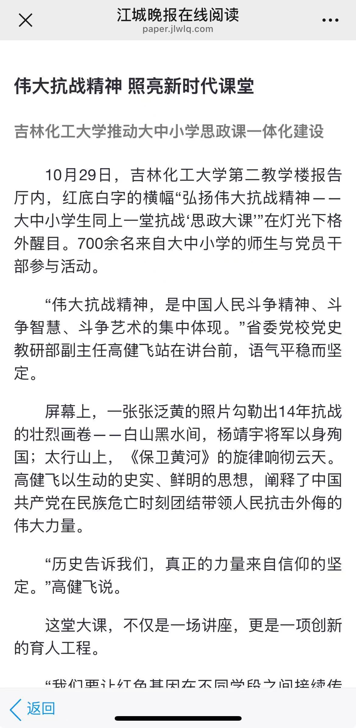 10月29日,吉林化工大学第二教学楼报告厅内,红底白字的横幅“弘扬伟大抗战精神——大中小学生同上一堂抗战‘思政大课’”在灯光下格外醒目。700余名来自大中小学的师生与党员干部参与活动。